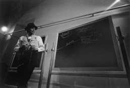 L’Italia fu, accanto alla Germania, il paese dove, dal 1971 alla morte, Beuys (1921-1986) trovò terreno fertile per le sue affermazioni e le sue attività artistico-rivoluzionarie, intessendo relazioni intense con galleristi, critici e artisti. Il 21 aprile 1972 Abate va a Palazzo Taverna per assistere a un intervento dell’artista, che aveva conosciuto nel 1969 a Berna e di cui fotograferà in seguito gran parte del lavoro. Lo immortala mentre spiega la sua teoria sociale e scrive su lavagne davanti al pubblico. La prospettiva è dal basso perché, come tutti, anche Abate era seduto a terra in ascolto.
