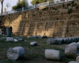 In occasione della rassegna Giganti – Arte Contemporanea nei Fori Imperiali di Roma (6 ottobre – 5 novembre 2000) in cui artisti di fama internazionale vengono chiamati a dialogare con le rovine dei Fori Imperiali, Abate fotografa le opere allestite nello spazio archeologico di giorno e di notte in base alla luce più corretta. Marina Abramovic (1946), figura iconica dell’arte contemporanea internazionale, che in quello stesso anno realizza al Manicomio di Volterra la performance Mambo a Marienbad, espone appoggiate alle mura perimetrali degli scavi le sue scale fatte di coltelli.