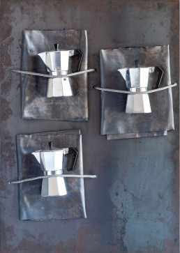 Lamiera in ferro, piombo, cavo d’acciaio e tre caffettiere